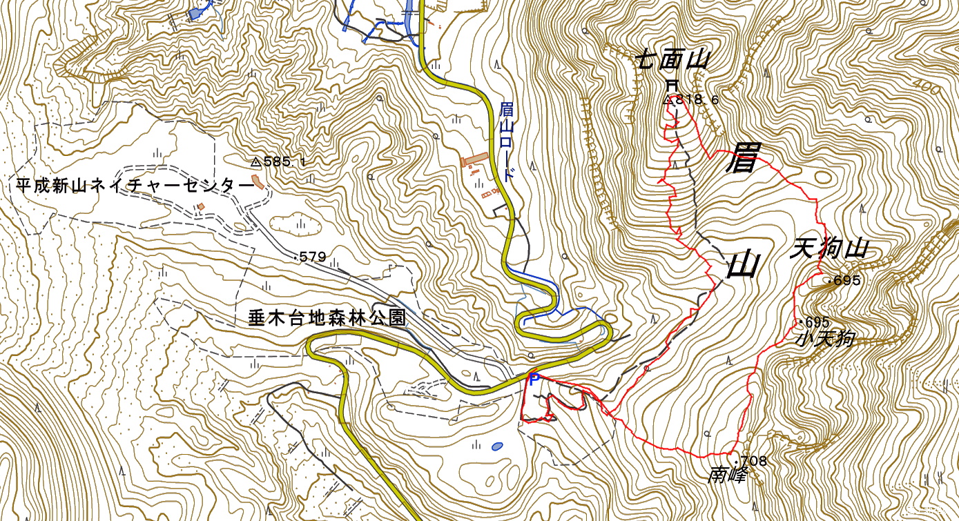 眉山登山口(9:10)−(9:40)南峰−(10:05)小天狗−(10:23)天狗山−(10:52)鞍部−(11:27)眉山−(12:23)登山口