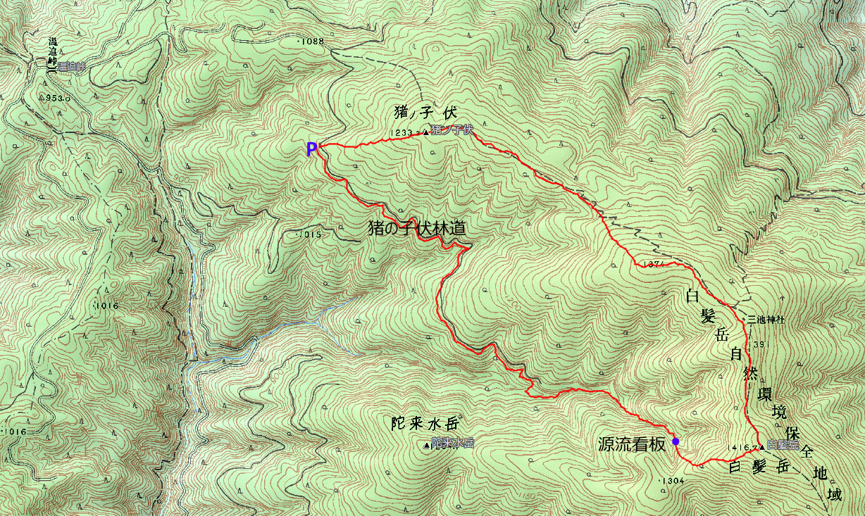 −(11:43)川内川源流(11:50)−(12:11)尾根(12:30)−(12:45)白髪岳−(13:23)三池神社−(14:31)猪子伏−(14:45)登山口 |