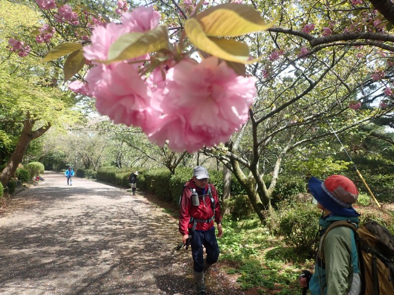 左 八重桜と郡岳