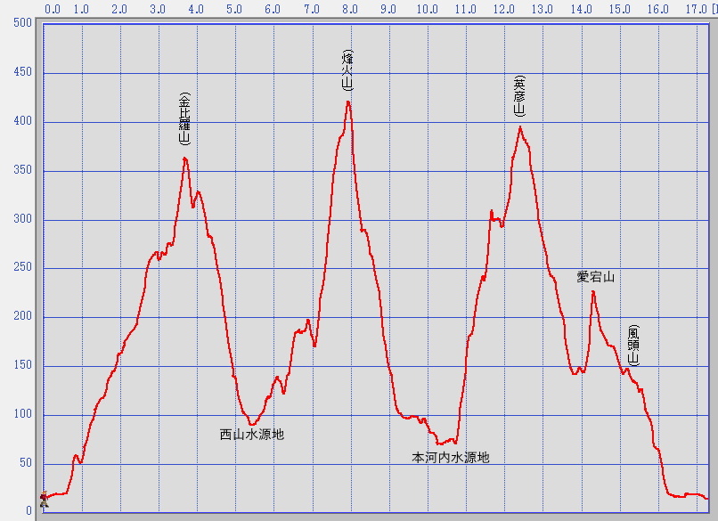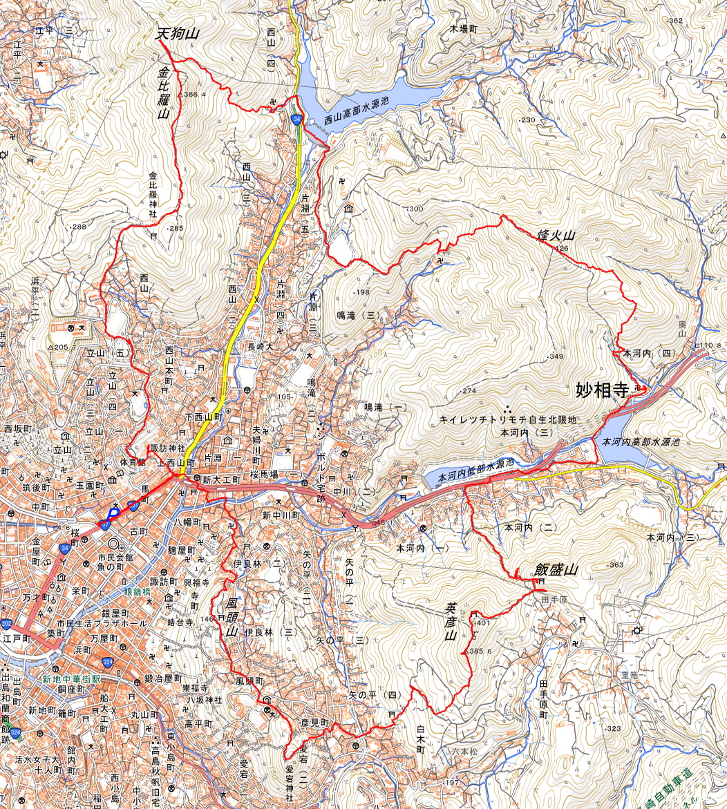 桜町駐車場(7:20)−(7:58)諏訪神社(8:07)−(9:00)金毘羅神社−(9:26)金毘羅山−(9:46)天狗山−(10:20)西山ダム