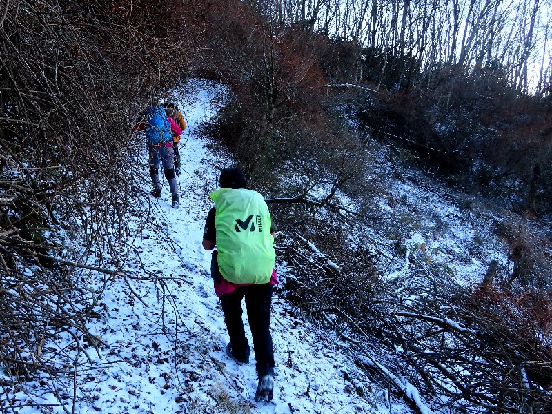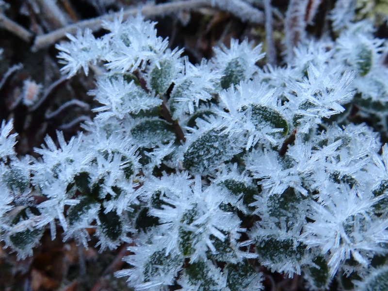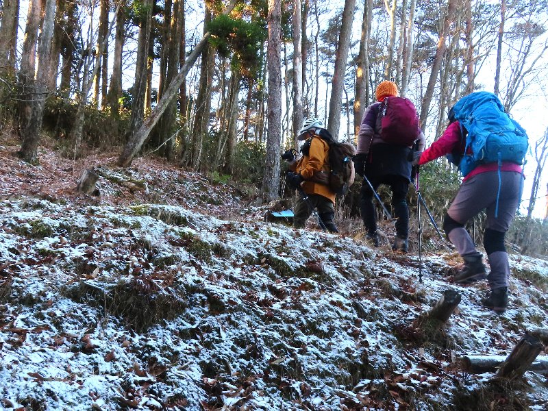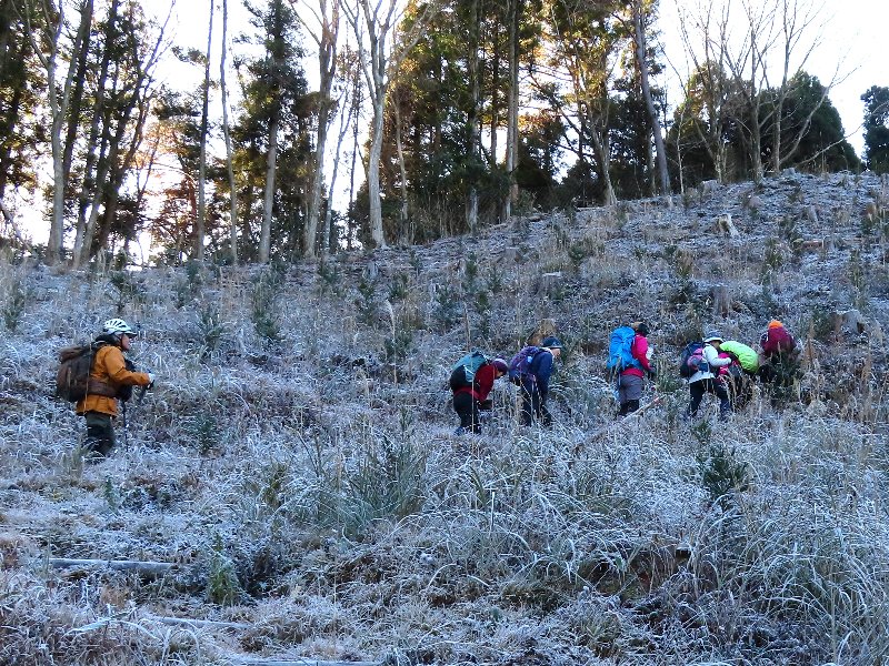 左 霜の中を登る。